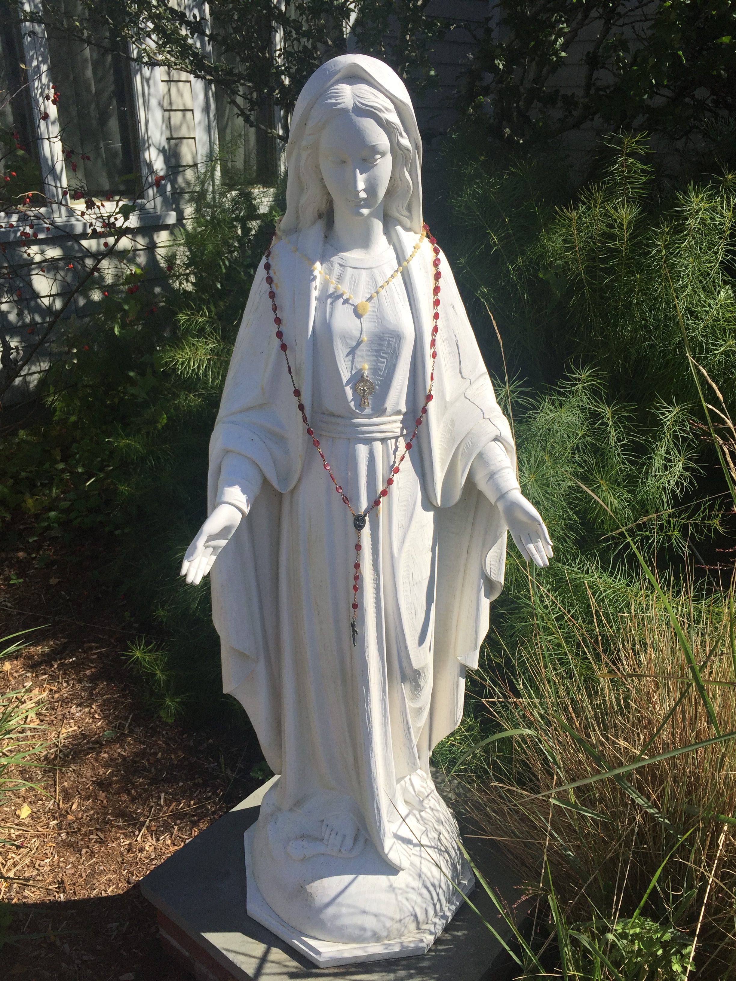 I was driving on, no joke, the Cranberry Highway–all hail the twee names of New England!–when I saw the Blessed Mother beckoning today. It’s enough to make me laugh though I never would at dear Mary, because it turns out she was answering my shallowest of prayers: to find a marvelous local thrift shop. Silk scarves and a leather trench coat she did lay upon me, as her son might have conjured loaves and fishes. With grace and an unappreciated wink,  reminds us of the magic of faith. How we need her sweetly sturdy beauty now.
