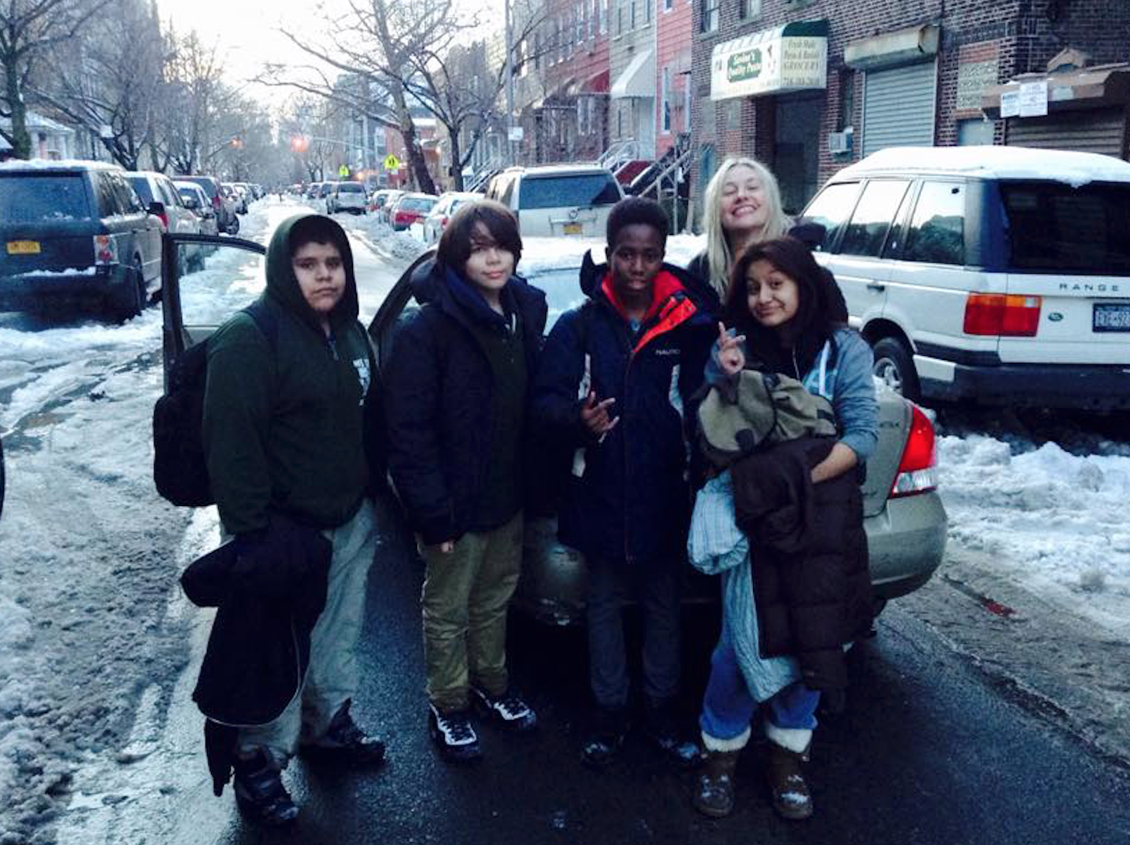 By 5:30, as I steered and they pushed, the car glided out of the snowbank into the road. We all hollered happily. I offered them rides home but everyone knew they’d be in a lot more trouble if they took a ride from a strange lady. Instead, we took a picture of the five of us on Xavier’s phone. He says he’ll send it on but even if he doesn’t I’ll remember that moment for a while to come. The bunch of us standing in the middle of Conselyea Street, in front of my idling car and the last rays of today’s sun. Yet another beautiful Brooklyn day, and I’m grateful to be grateful. (Update: Xavier sent the photo, pictured above!)